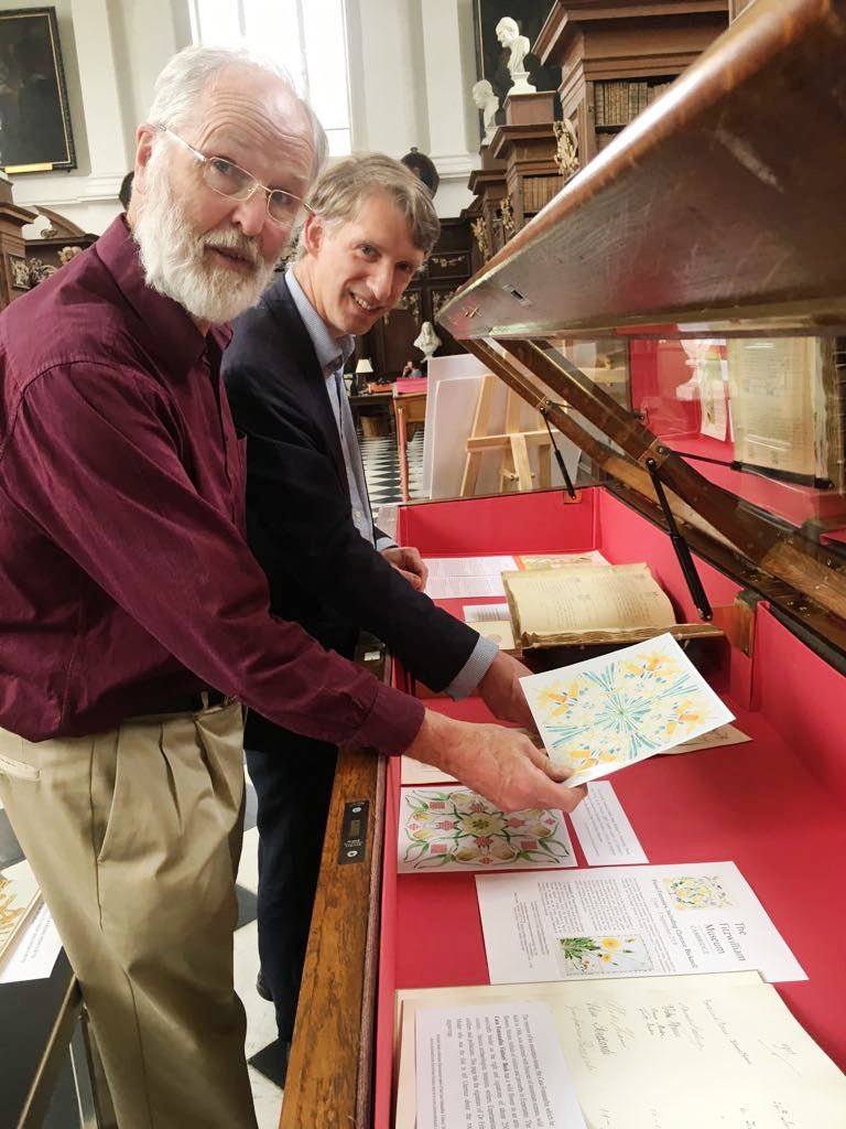 Exhibition at the Wren Library, Trinity College, Cambridge. Nick Bell from the Wren Library has contacted Marcus asking if Clarence Bicknell material could be lent to a botanical art exhibition being organised by art students from 22 February for a week. The exhibits will be similar to those in the 2018 exhibition there including two original vellum-bound albums (photo of Marcus Bicknell and Nick Bell in 2018 above).